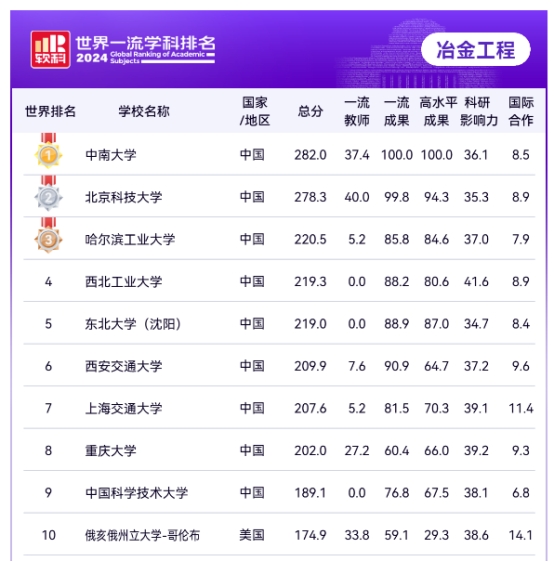 2024软科世界一流学科排名发布,必威 冶金工程学科再次登顶